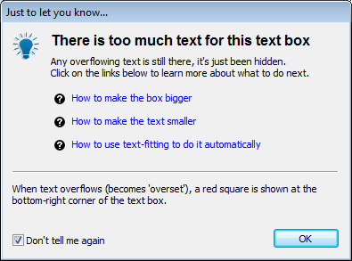 This is because there is now too much text for the original text box. This warning only appears once just to get people used to the idea of overflowing ('overset') text since it's a bit different to the way a simple word processor works. - To resize the text box and make room for the text, drag the left and right handles outwards to make the box wider. You should eventually be able to get the text to fit. If you can't you could try using the automatic text fitting features.