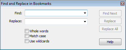 - Replace will jump to the next occurrence of the text in the bookmarks tree. Press it again to do the replacement and move onto the next.