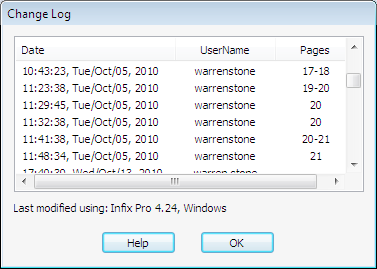 Document OperationsTracking changes Change Log The change log records the date, user-name and pages modified. Modifications made by other PDF editors are not recorded. Choose Document->Change Log...