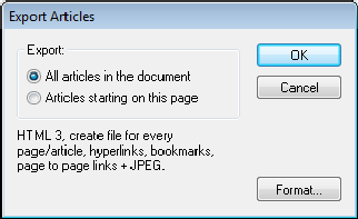 If your document contains no article threads you can create new articles. - Choose to export just the articles beginning on the current page, or all articles in the document. If no articles begin on the current page, only one option will be available.