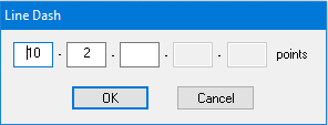 - The values shown in the example below would define a dash pattern starting with a line of 10 points then a gap of 2 points. This pattern would repeat for the entire length of the line.