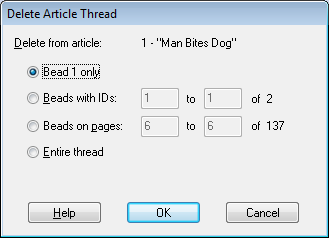 - If there are multiple box in your article thread, the Delete Article dialog box gives you the option of deleting the entire article thread, the currently selected article bead (in this case bead 1), all beads in a range of IDs or all beads across a range of pages.