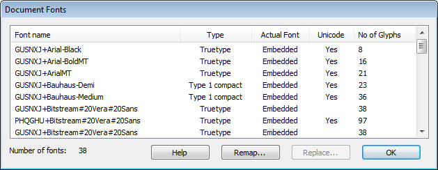 The number of characters shapes defined by the font. To save space, PDF producers only include definitions for the character shapes actually used in a PDF. - Select a font then click Replace... to open the Find and Replace Font dialog box.