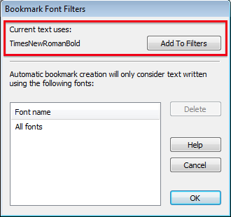 Any font not mentioned in the list will be ignored during automatic bookmark creation. - Repeat steps 2 - 6 for all the fonts you want to be eligible for automatic bookmark creation.