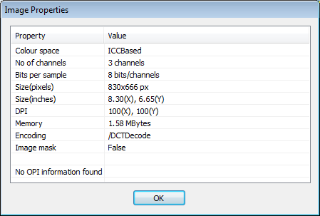 Editing ObjectsImages Properties To see the properties of an image such as it's resolution and colour depth: Select the Object tool () from the tool bar. Click on an image to select it. Choose Object->Image->Properties...