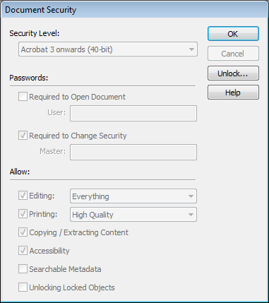 If the document has been secured, the security dialog box will display with most controls inactive. However the controls still show the current security settings such as whether or not editing is allowed.